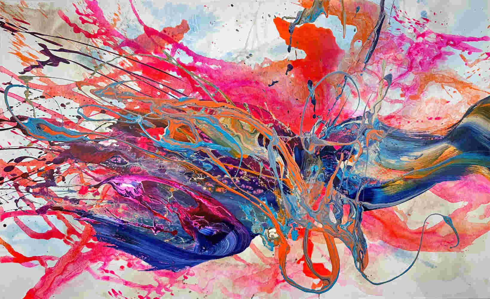 …and the Butterfly goes wild – das ist überbordende Farbfülle, ein Farbrausch voller Lebensfreude und kraftvoller Energie. Pink, Orange, Rot und Blau wirbeln über die Leinwand, sprühen Funken wie der ungestüme Flügelschlag eines Schmetterlings, der seine erblühende Umgebung erobert. Im scheinbar wilden Chaos offenbart sich eine geheimnisvolle Ordnung – wie die Natur selbst, verschwenderisch, kraftvoll und voller Zauber. Dieses Bild lädt ein, sich vom Überschwang der Farben tragen zu lassen und den eigenen Blick immer wieder neu in ihren Wirbeln zu verlieren.