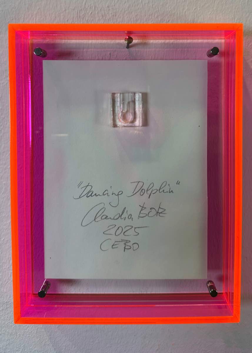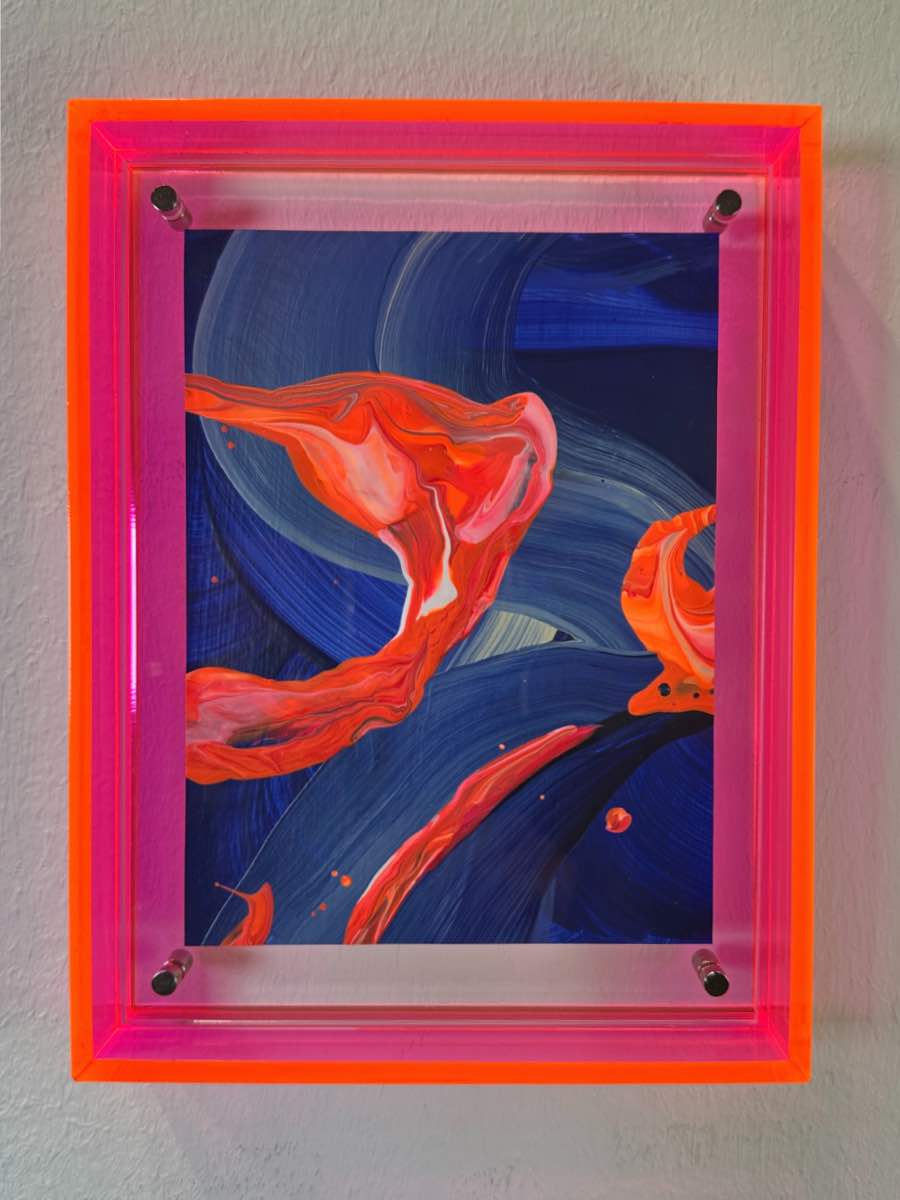 „Dancing Dolphin“ Traumhafte Mini Kunst pink blau und orange mit leuchtendem Acrylrahmen in Pink. Die fliessende Bewegung überträgt pure Energie an Ihre Wand – jetzt direkt online kaufen.