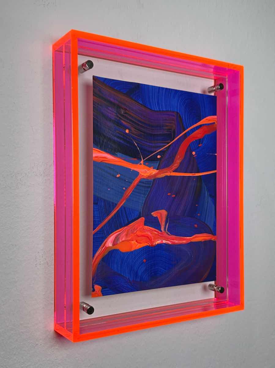 „Energy is Rising“ Traumhafte Mini Kunst pink blau und orange mit leuchtendem Acrylrahmen in Pink. Die fliessende Bewegung überträgt pure Energie an Ihre Wand – jetzt direkt online kaufen.