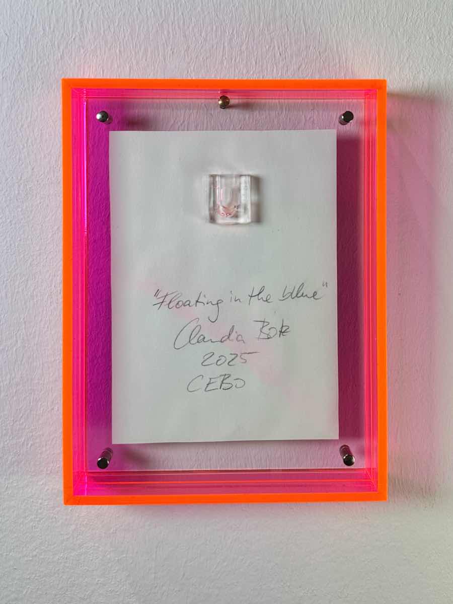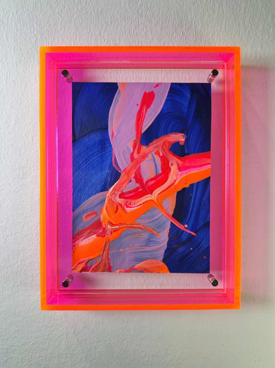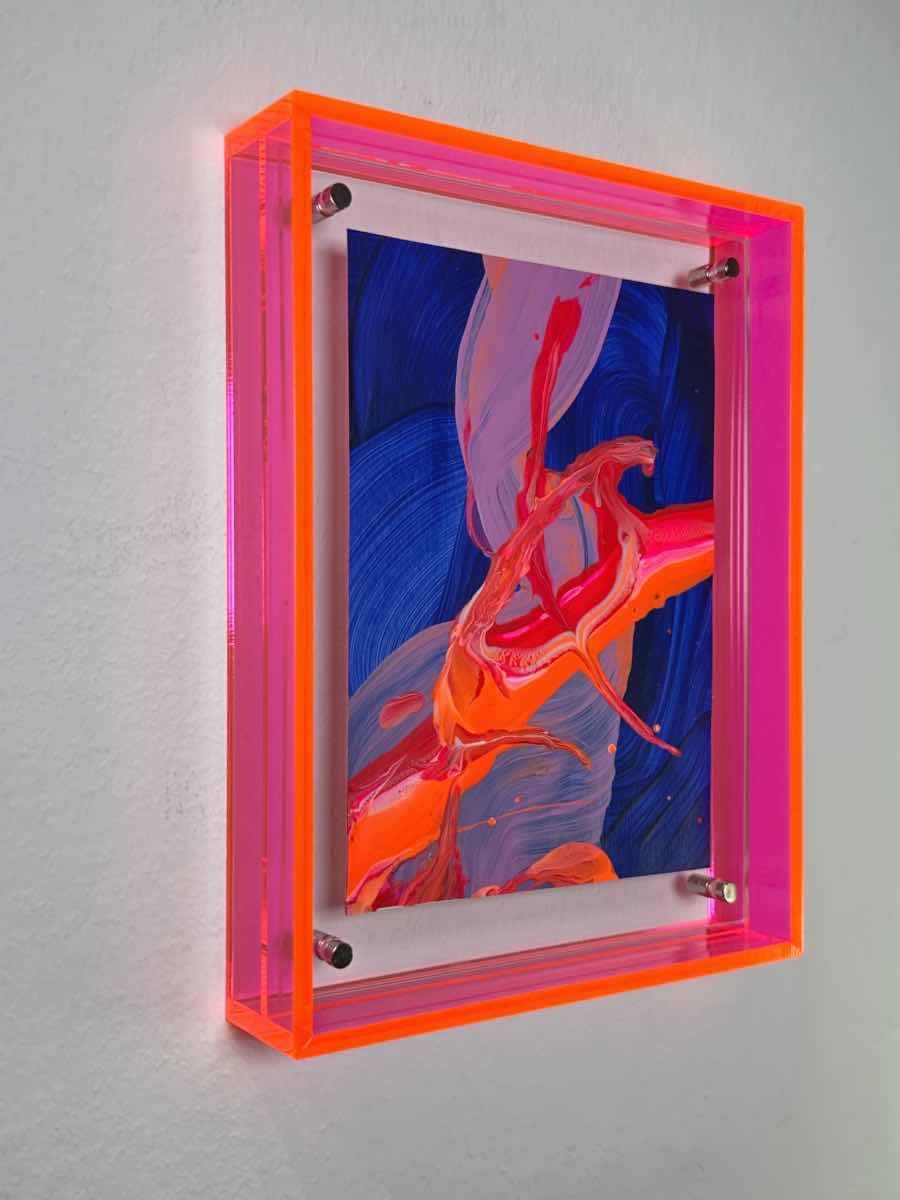 „Floating in the Blue“ Traumhafte Mini Kunst pink blau und orange mit leuchtendem Acrylrahmen in Pink. Die fliessende Bewegung überträgt pure Energie an Ihre Wand – jetzt direkt online kaufen.