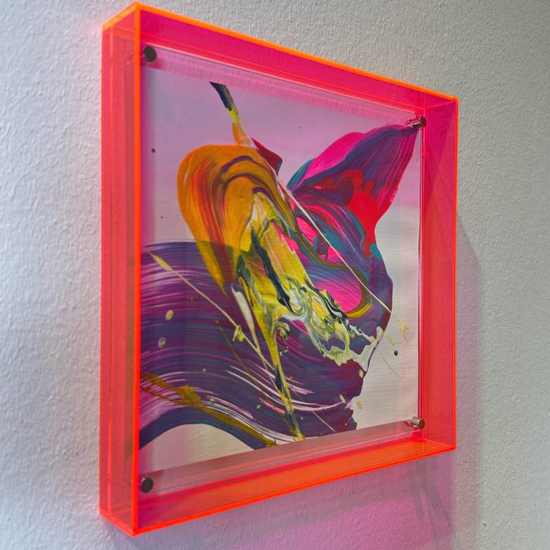 „Super Power“ Traumhafte Mini Kunst in pink gelb und violett mit leuchtendem Acrylrahmen in Pink. Die fliessende Bewegung überträgt pure Energie an Ihre Wand – jetzt direkt online kaufen.